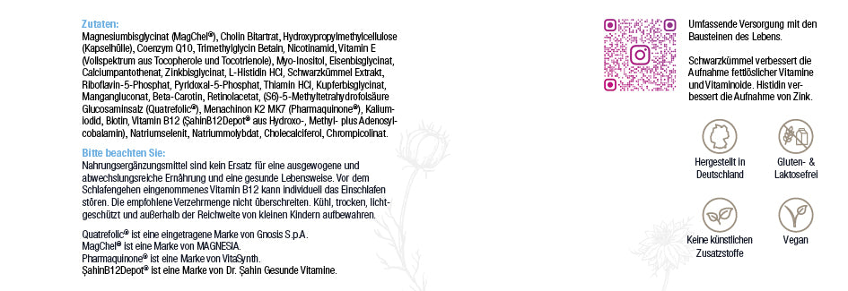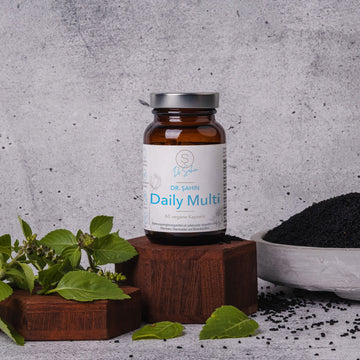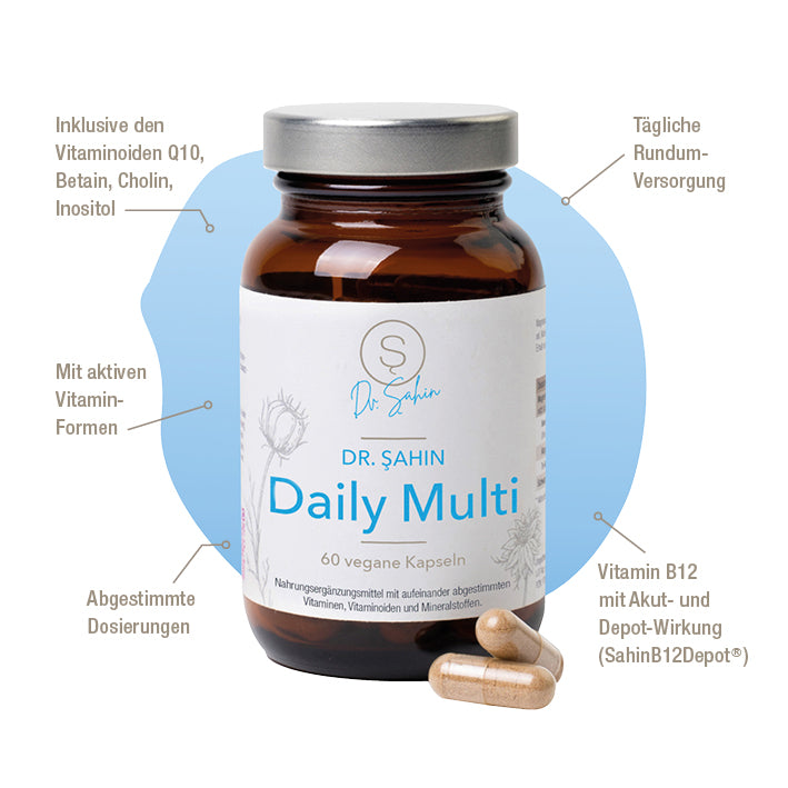 Neben klassischen Mikronährstoffen enthält Dr. Şahin Daily Multi auch wertvolle Vitaminoide wie Coenzym Q10, Betain, Cholin und Inositol. Diese unterstützen den Energiestoffwechsel, die Zellgesundheit und die Nervenfunktion. Damit bekommst du nicht nur die Basisversorgung, sondern ein Plus an Unterstützung für Körper und Geist – für mehr Vitalität im Alltag.