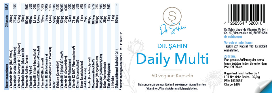 Dr. Şahin Daily Multi liefert dir eine umfassende Kombination aus Vitaminen, Mineralstoffen und Spurenelementen in bioaktiver Form. So wird dein Körper jeden Tag zuverlässig mit allem versorgt, was er für Energie, Leistungsfähigkeit und ein starkes Immunsystem braucht. Besonders in Zeiten von Stress, Sport oder unausgewogener Ernährung ist die tägliche Ergänzung ein wertvoller Begleiter für deine Gesundheit.