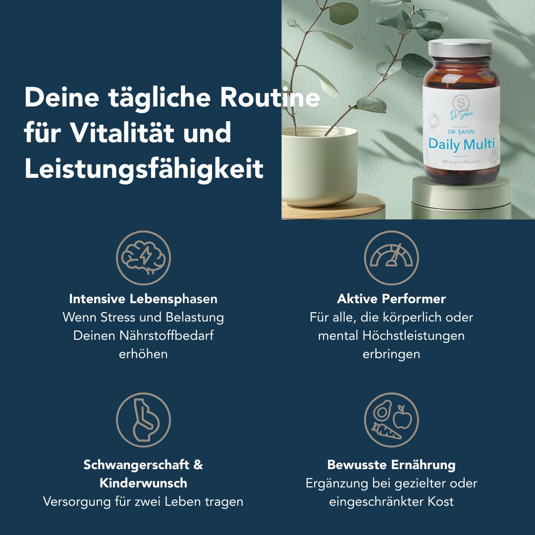 Neben klassischen Mikronährstoffen enthält Dr. Şahin Daily Multi auch wertvolle Vitaminoide wie Coenzym Q10, Betain, Cholin und Inositol. Diese unterstützen den Energiestoffwechsel, die Zellgesundheit und die Nervenfunktion. Damit bekommst du nicht nur die Basisversorgung, sondern ein Plus an Unterstützung für Körper und Geist – für mehr Vitalität im Alltag.