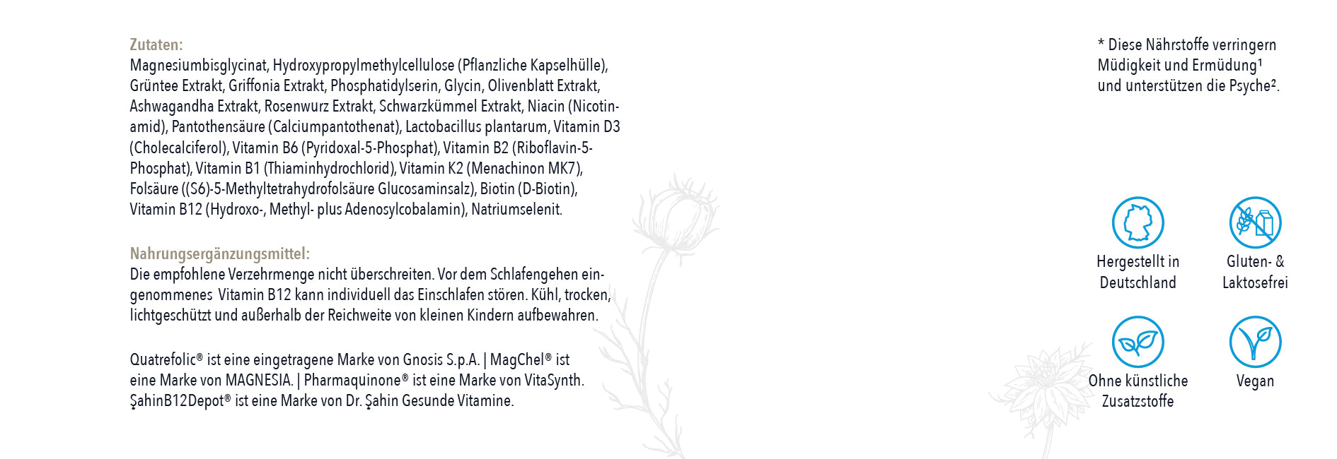 | Griffonia Extrakt (100 mg 5-HTP) | 320 mg | Aminosäure-Vorstufe |