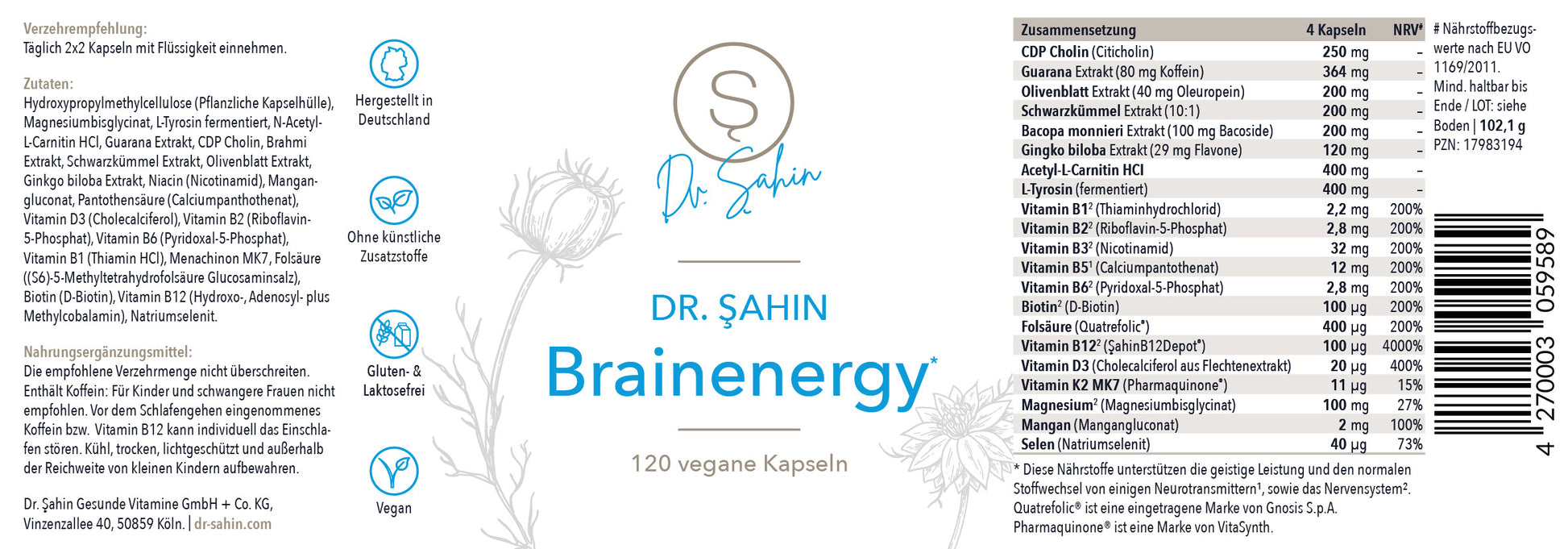 Dr. Şahin Brainenergy kann dazu beitragen, mögliche Versorgungslücken an den enthaltenen Vitaminen und Mineralstoffen zu schließen oder gar nicht entstehen zu lassen.