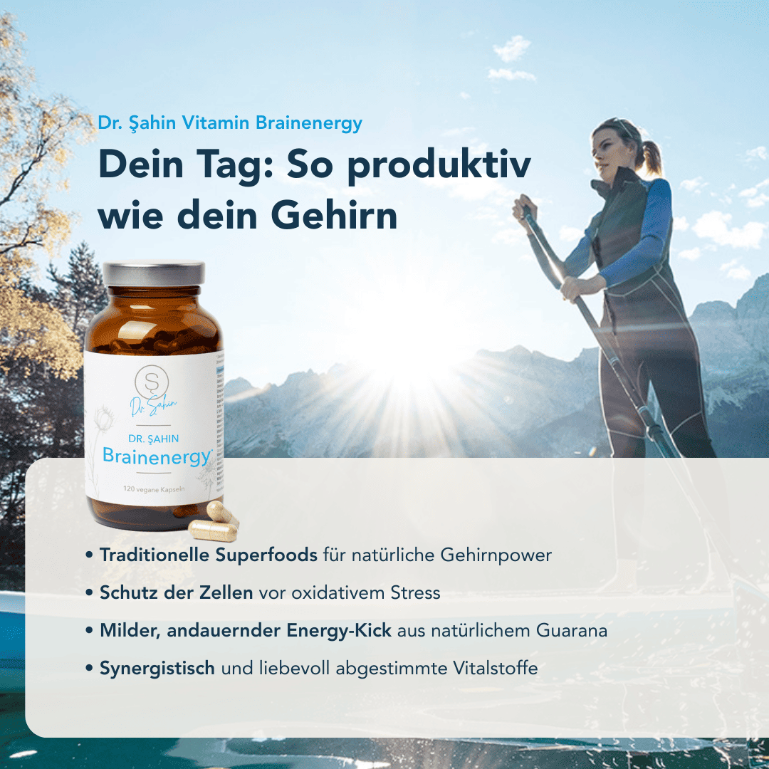 Dr. Şahin Brainenergy unterstützt dich bei Konzentration, Gedächtnis und mentaler Ausdauer. Mit Citicolin und Acetyl-L-Carnitin enthält es eine kraftvolle Kombination, die den Energiestoffwechsel der Nervenzellen stärkt. Ergänzt durch wichtige B-Vitamine und Magnesium trägt es zu einer normalen Funktion des Nervensystems bei und hilft, geistige Ermüdung zu reduzieren.