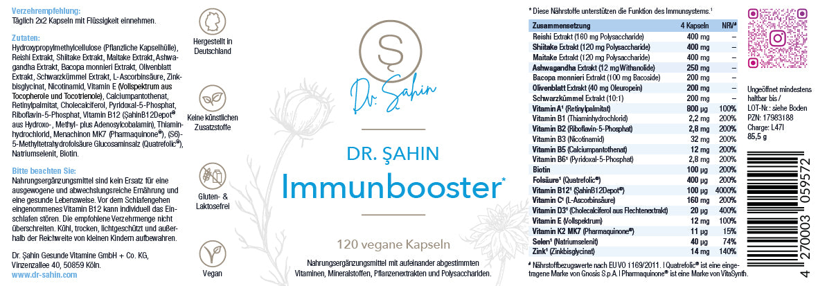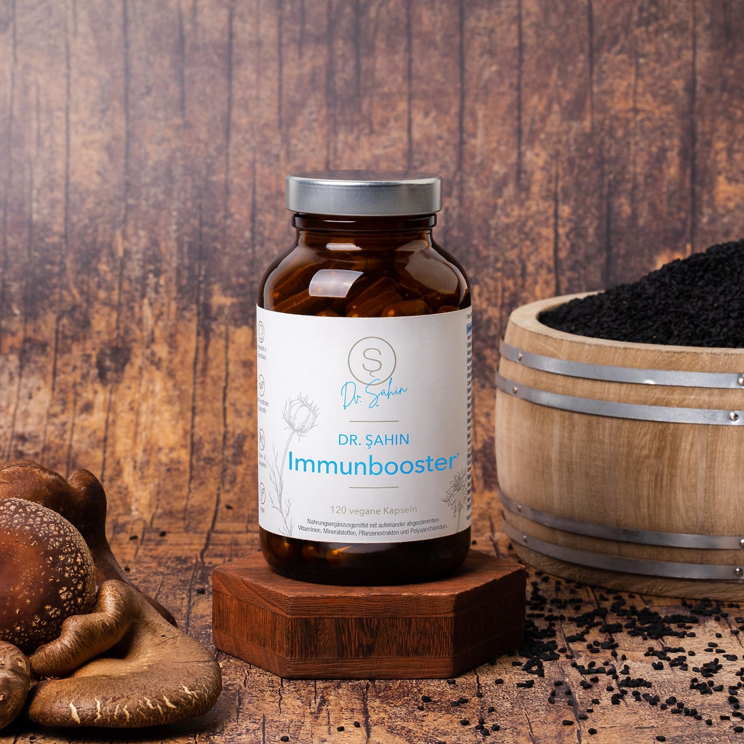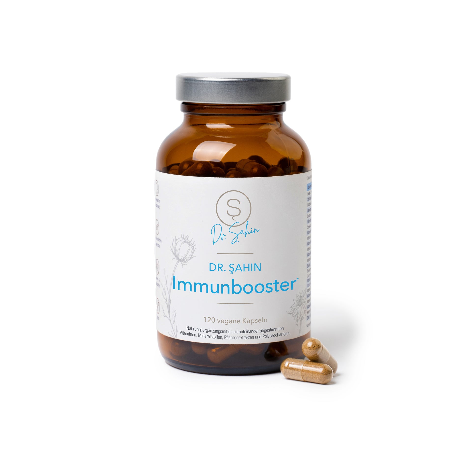 Dr. Şahin Immunbooster kombiniert essenzielle Vitamine und Mineralstoffe wie Vitamin A, B6, Folat, B12, C, D, Selen und Zink. Diese tragen entscheidend zu einer normalen Funktion des Immunsystems bei und helfen, den Körper gegen äußere Belastungen zu schützen. So erhältst du eine zuverlässige Unterstützung für deine Abwehrkräfte – das ganze Jahr über.