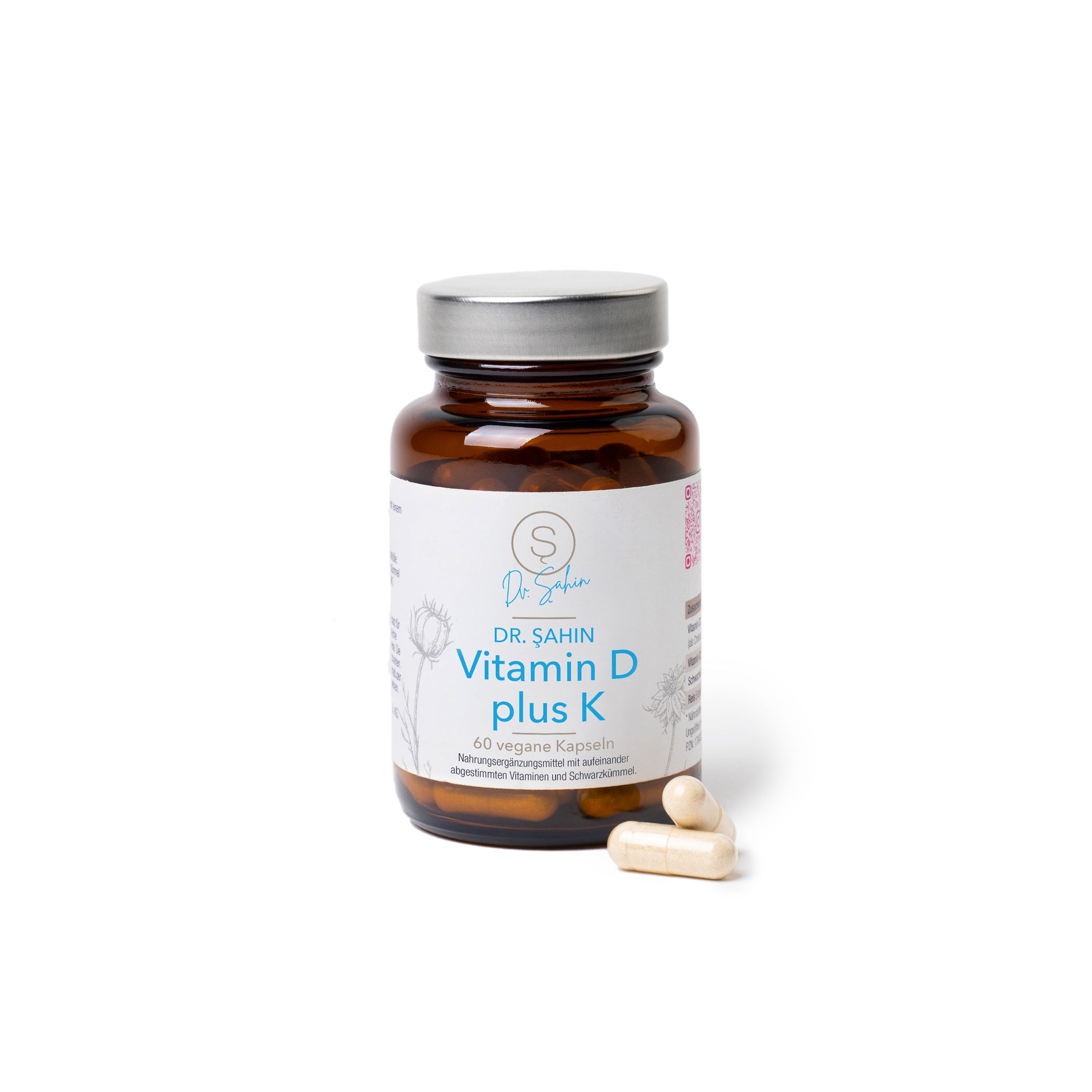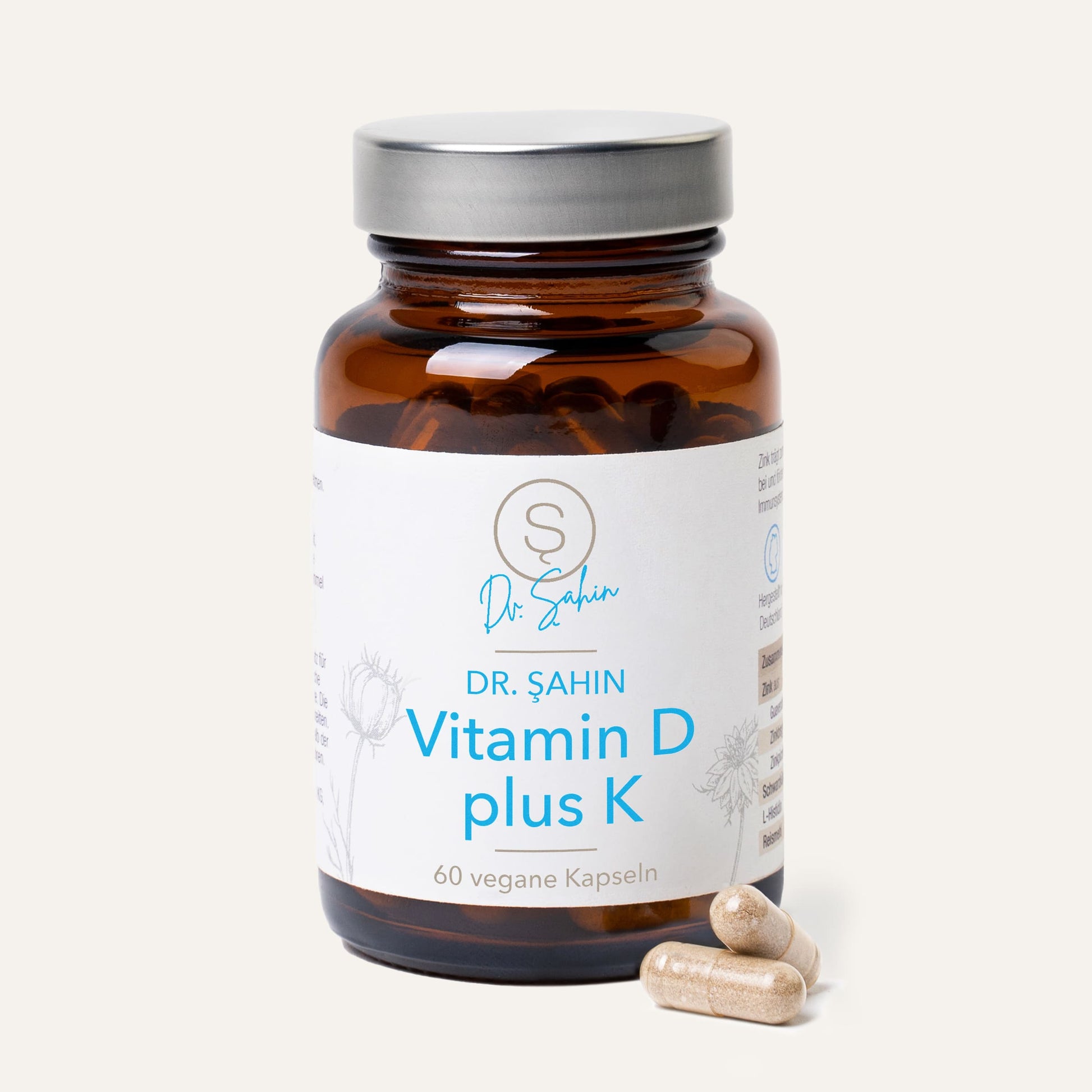 Dr. Şahin Vitamin D plus K kombiniert hochdosiertes Vitamin D3 (5.000 IE) aus veganen Flechten mit Vitamin K2 in der aktiven Form MK7. Gemeinsam tragen sie zur Erhaltung normaler Knochen und einer normalen Muskelfunktion bei und unterstützen gleichzeitig die Abwehrkräfte.